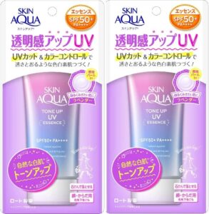 Kem chống nắng Skin Aqua Tone Up UV Essence SPF50+/PA++++ được sản xuất và phân phối bởi Skin Aqua, một nhánh nhỏ thuộc thương hiệu mỹ phẩm Rohto Mentholatum tại Nhât Bản. Là dòng kem chống nắng vật lý lai hóa học ưu việt, sản phẩm chứa vitamin C và HA cấp ẩm cho da đồng thời làm tốt nhiệm vụ chống nắng. Phiên bản Essence phù hợp với mọi loại da.